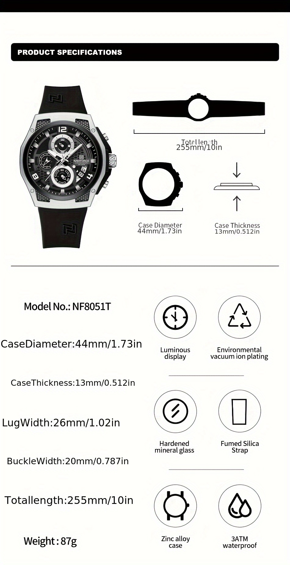 Built with a durable zinc alloy case and a comfortable silicone strap, it’s made to handle every moment of your day — from the gym to the office. The chronograph stopwatch and date display keep you organized, while the precision quartz movement ensures accurate time, every time.